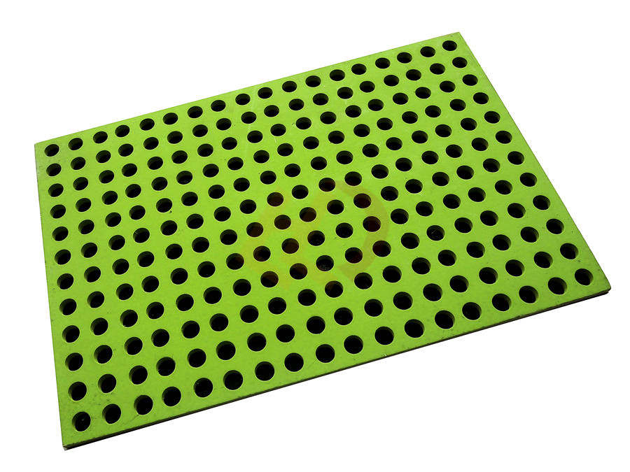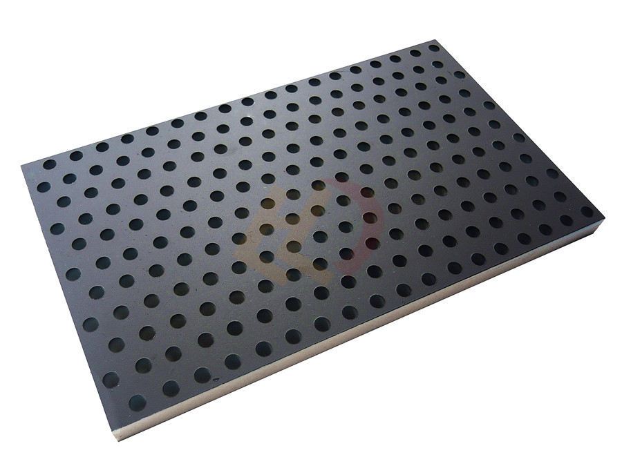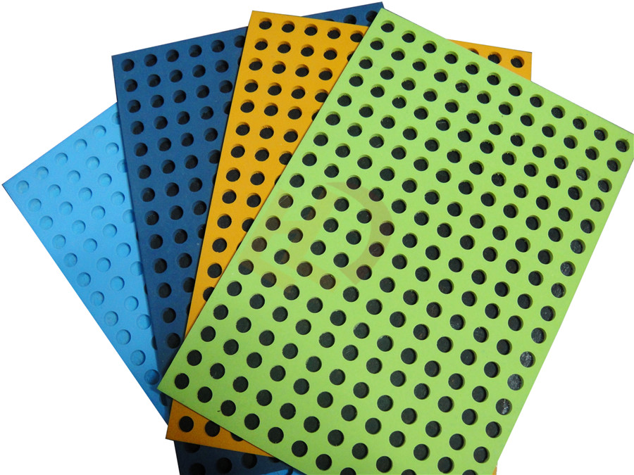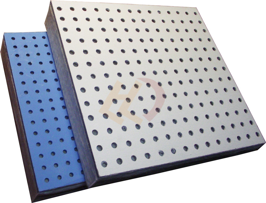 PVC穿孔吸聲板可與全封閉的玻璃棉板或者聚酯纖維棉板復(fù)合。全封閉的玻璃棉板和聚酯纖維棉板表面的高彈性可增加低頻可增加低頻吸聲性能。
